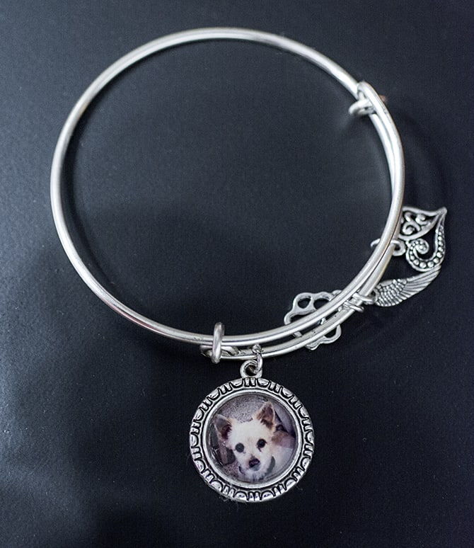 | Heather wears this bracelet as a way of honoring her dog Pumpkin who died in August. |