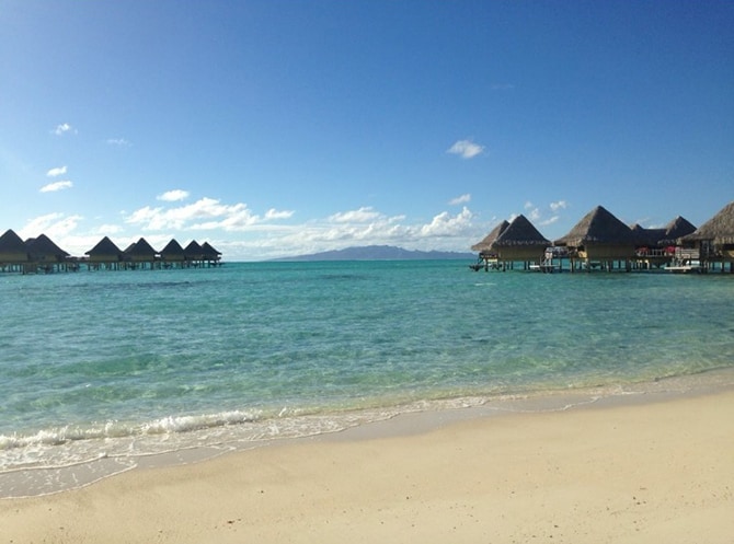 | Brandi takes in the view of the overwater bungalows while sitting on the beach at their hotel. |