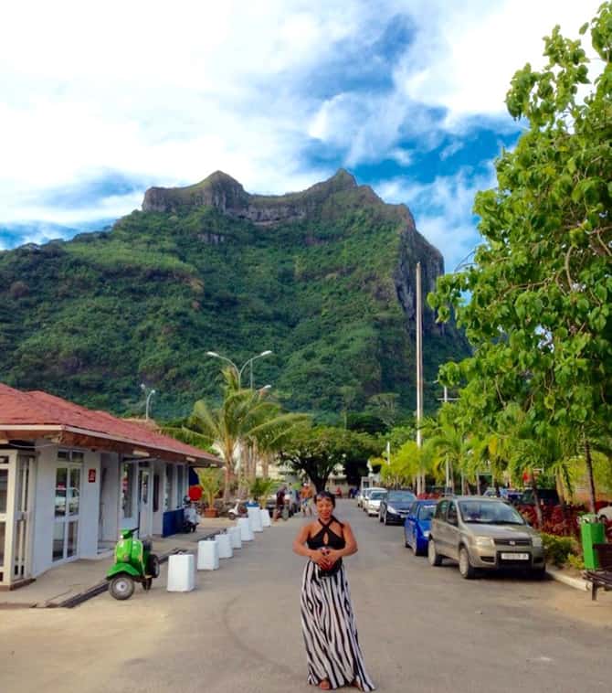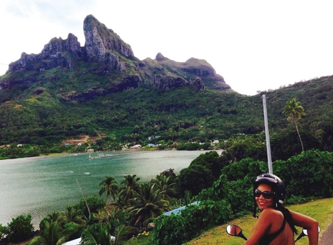 | Brandi took a scooter ride around the island. The mountain seen in this photo is in the center of the island. Mount Pahia and Mount Otemanu are the two peaks that form the mountain. |