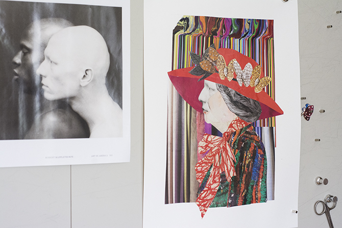| For this paper mosaic from the Wonderful Old Women series, Ann used a photo of Robert Mapplethorpe and transformed it into Esther. “This is sort of a before and after using duplicate photographs.” |