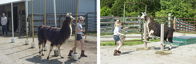| The llamas are taken through an obstacle course in preparation to be shown at the Floyd County Fair. Isabella is teaching Potter how to walk through this hoop. |