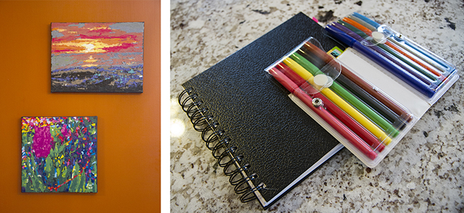 | These painting, which hang on Melissa’s wall, are two of her favorites pieces; and she is never without her markers and sketch pad. |
