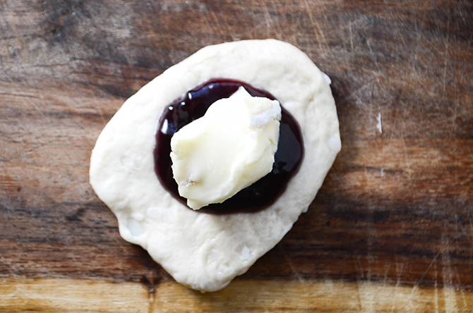 Bring all of the edges up and pinch together to close around the filling. Set aside while you continue filling all of the biscuits.