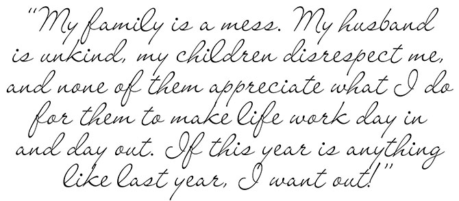 Q: “My family is a mess. My husband is unkind, my children disrespect me, and none of them appreciate what I do for them to make life work day in and day out. I am simply going through the motions, and I’m exhausted. How can I undo what is happening? If this year is anything like last year, I want out!”