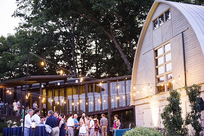 Why it worked: “The reception was probably the most controversial part of our wedding planning. Questions kept popping up like, what about elderly people? Where will close family sit? How will food work? Will people want to stay if they don’t have a table? But in spite of all these issues, it worked wonderfully. We had enough open tables for those who really wanted to sit, but most people really embraced the outdoorsy, picnic vibe of the reception. We had included extra information in our invites so people would have an idea of what to expect, and everyone ended up having a wonderful evening.”