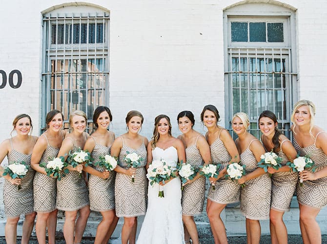 Why it worked: I wanted dresses that my bridesmaids could wear again and that didn’t look like your typical bridesmaids dresses. I also knew I wanted something that was short, but still looked classy. I had seen these in pictures before in the longer versions and knew right away that this is what I wanted when I found them online in the shorter version. The cut/style of the dress looked good on all of my bridesmaids, who were all very different in height/size — highly recommend these dresses! They also didn’t really need much altering, which was a cost saver for my bridesmaids.