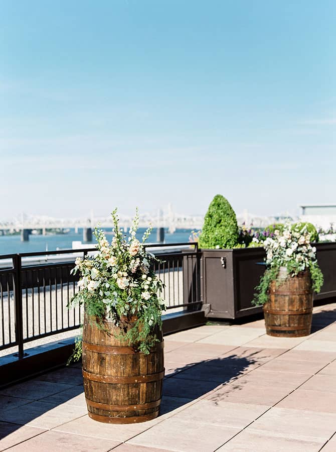 Why it worked: The rooftop already has lots of flowers and greenery planted to decorate the space. And it overlooks the Ohio river, so it is naturally just a pretty, intimate place for a ceremony. We only had to add two flower arrangements on bourbon barrels and some flowers on the chairs, which was so nice and helped to keep our floral costs down. I know sometimes venues need a lot of sprucing up, and it was great at the rooftop of the Frazier because it was basically already done! We also chose to have our ceremony at 6:30pm since it was in June in hopes of it not being so hot. There was a nice breeze on the rooftop, and it ended up being perfect!