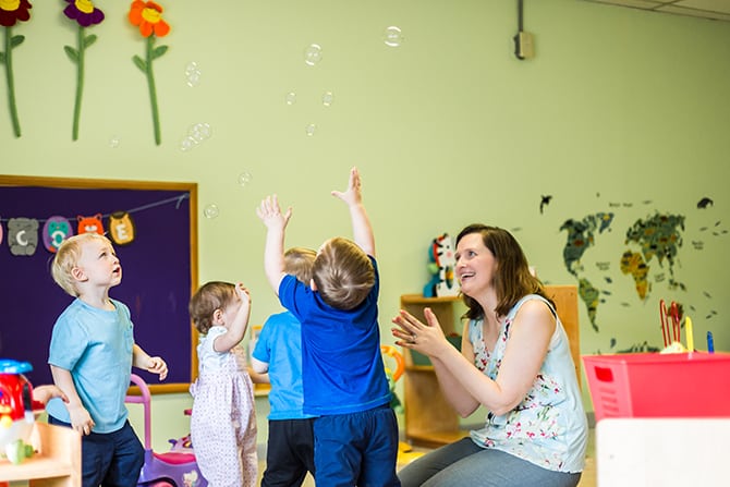| These students catch bubbles and sing during music time in the toddler room. Photos by Trina Whalin |