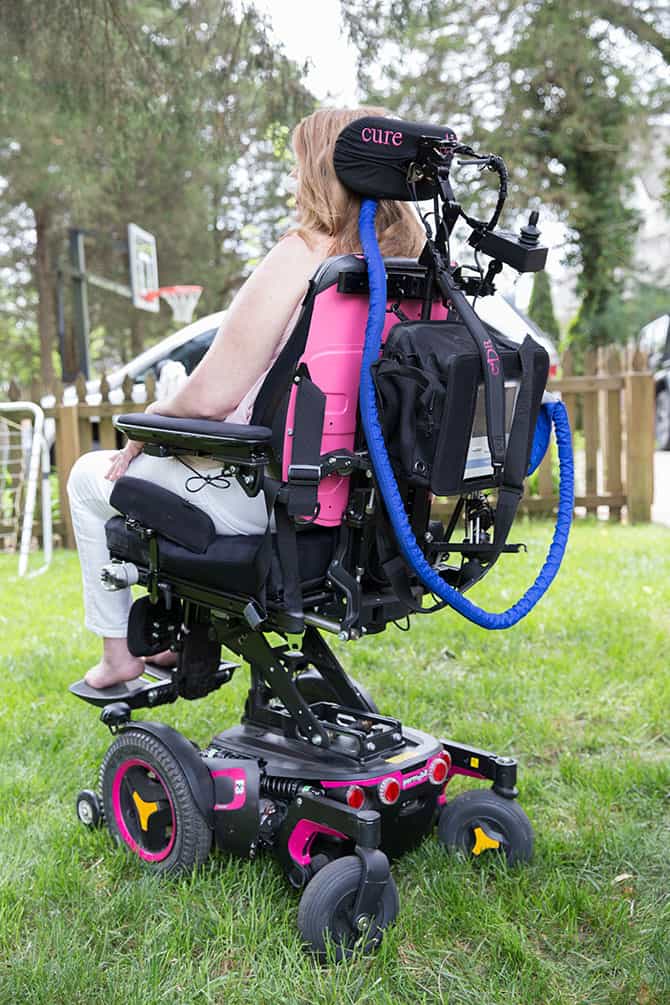 | Carrey’s motorized wheelchair has helped her maintain mobility with the progression of the disease. |