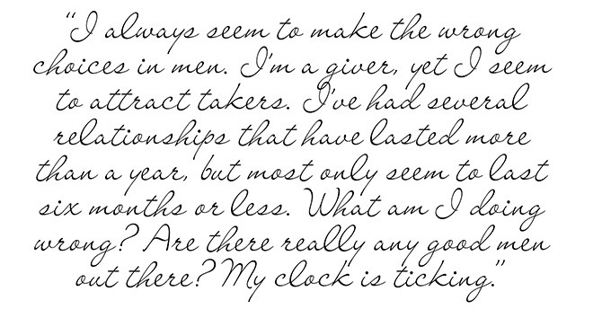 Q: “I always seem to make the wrong choices in men. I’m a giver, yet I seem to attract takers. I’ve had several relationships that have lasted more than a year, but most only seem to last six months or less. What am I doing wrong? Are there really any good men out there? My clock is ticking.”