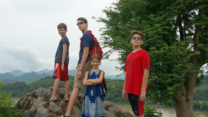 | (L-R) Lachlan, Finley, Zaylie, and Whitman stand at the top of a temple in Luang Prabang, Laos. |