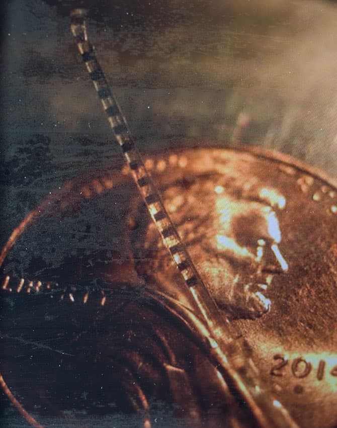 | This cochlear implant has been placed on a penny to show its length. |