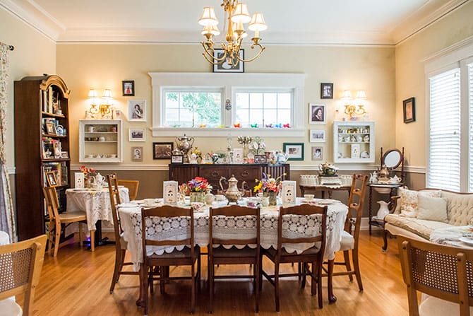 Carrie, an old soul who loves anything with a past, nonchalantly uttered the aforementioned phrase when dishing about decorating her 100-year-old historic home in Corydon, Indiana. The home is colonial but decorated in the Victorian-style era. She shops vintage stores and thrift shops such as Crescent Hill Trading Company and Crazy Daisy to not only fill her home with fanning couches and prints, but also enough mismatched tea sets to create her and her husband, Jeff’s, happy accident — a tea room.
