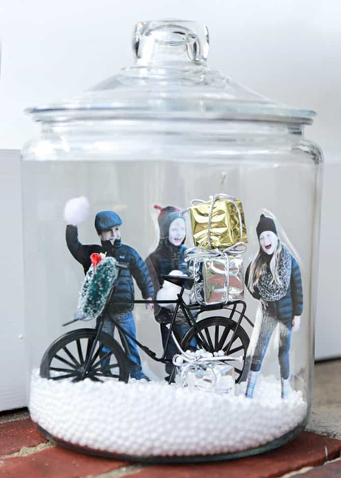 One particular December several years ago, I was watching through the front window as my children played in the snow. Their squeals of delight were muffled behind the panes of glass, but their joy was palpable. Their tiny red noses, their little bodies thick with layers, and the snowflakes falling from the sky like powdered sugar made my breath catch in my throat. A real-life snow globe scene was unfolding in front of me. As I pressed my face to the window to take it all in, an idea was born. I would recreate this scene and preserve it so that the moment would never be lost. After gathering a few supplies, I went to work creating a snowy setting using a photo of each child and copious amounts of faux snow. I was delighted with the outcome and the kids were mightily impressed to see themselves in the middle of a winter wonderland encased in a spaghetti sauce jar.