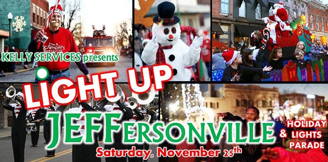 - The free fun begins at 4pm Saturday at Light Up Jeffersonville & Holiday Lights Parade, with train rides, inflatables, live entertainment, hot chocolate, visits with Prancer and Comet, and more.
