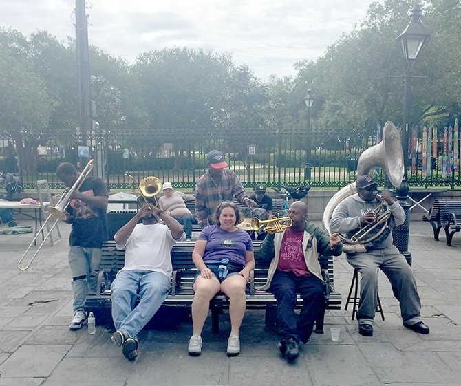 But the street music is available to everyone all the time — and it is still Debbie’s highlight when visiting this rich city. This year, she sang a duet of Blueberry Hill with a street musician. “Most people request buskers to play a song, I request to sing along. I think he was surprised that I could harmonize!” Debbie always carries a fanny pack filled with cash in multiple denominations. Ones are great for quick tips, fives for performances where you stay a while, 10s for CD purchases (Debbie’s go-to souvenir), and 20s for art pieces from Jackson Square.