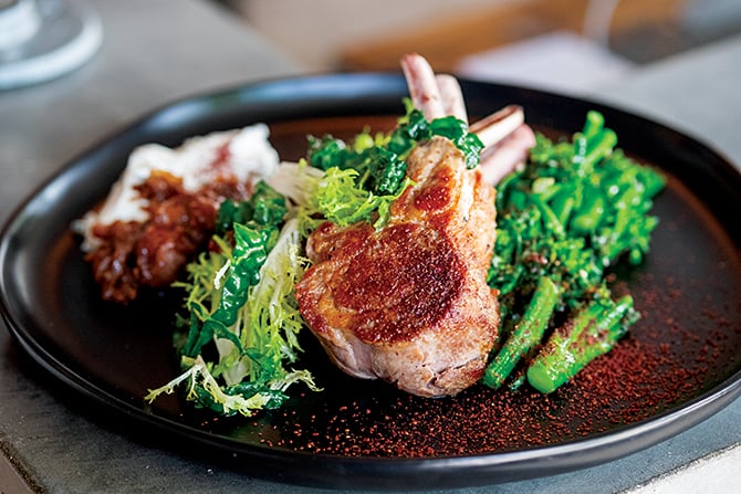 The simple method Dallas McGarity, owner of Fat Lamb, uses to prepare his lamb chops makes the flavors shine. They are seasoned with salt and pepper, then seared on a flat iron grill. The chops are served with sauteed garlic broccolini, eggplant capanota and a tzatziki,yogurt sauce sprinkled with sumac powder.
