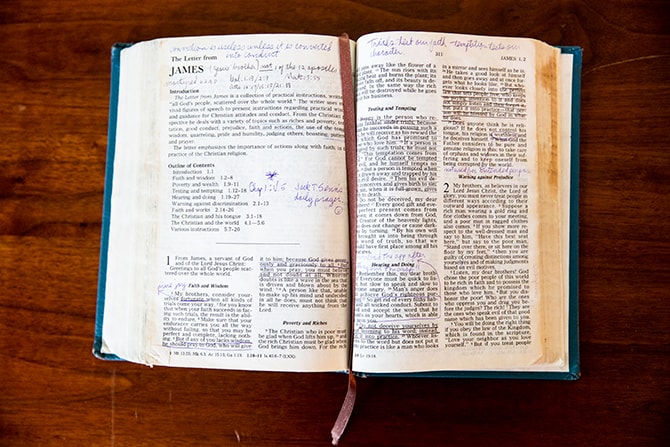 The Bible she received as a freshman in high school “It is so written in and cross referenced, it’s been re-bound once, and it’s heavily used,” Vickie says. “If I were to lose that, it would be devastating.”