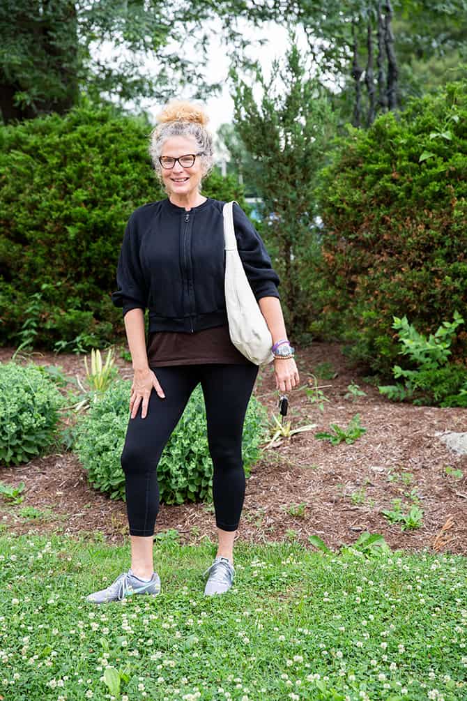For some women it’s about having the little black dress, but for me it’s having 10 pairs of black leggings. I wear the Champion brand sold at Target and also have leggings from Fabletics and The Gap. I am known as the grass roots gal on the go. I am always ready to work and work out. I wear my leggings, tennis shoes, and a nice black zip up jacket or black rain jacket.