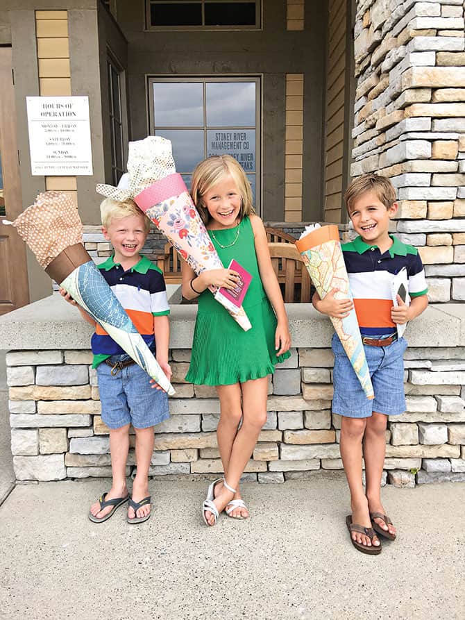 We get dressed up and go out for steak the night before school begins, but a delivery pizza or a breakfast for dinner tradition would work just as well. As we eat, we encourage each of the kids to set goals regarding academics, sports, and friendships. We discuss any fears or anxieties they may have about the upcoming year, and we say a prayer for their safety and success. After dinner we give them a Schultüte (German word meaning ‘school cone’) filled with a few school related gifts, from a new pair of school shoes or uniform piece to a shiny pencil box. They look forward to this tradition each year.