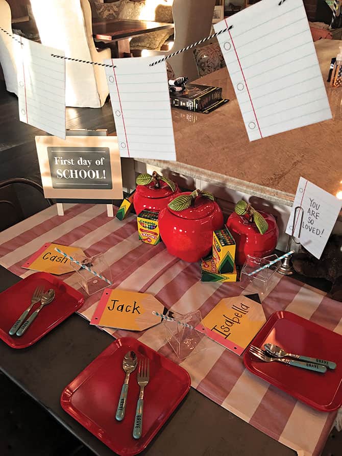 Getting the day started on a positive and happy note goes a long way to ensure that the first day back will be a success. I decorate a little table for them and choose a simple menu that I know won’t add any stress to an already hectic morning. (Hint: school supplies can double as place setting decor.)
