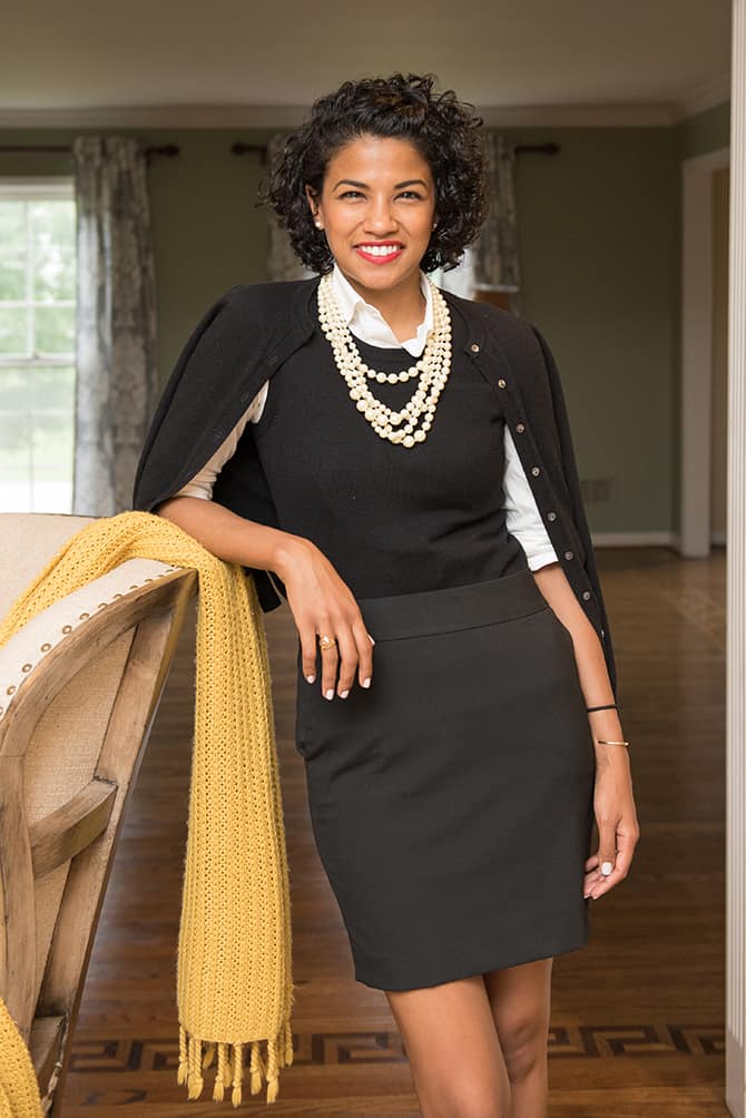 For one outfit, she wears “a black high-waisted pencil skirt and over that I will wear a white collared long sleeved shirt, or a white shirt with a ruffle at the neck. I add a tight black sweater vest, a heeled shoe and a bright red lipstick. It gives you the look of high polish and professionalism, like Janelle Monae.”