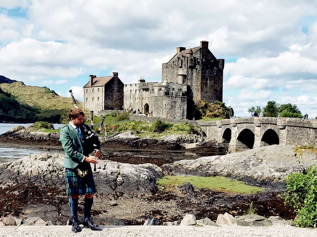 A bagpiper stands in front of the Eileen Donan Castle near the Isle of Skye.