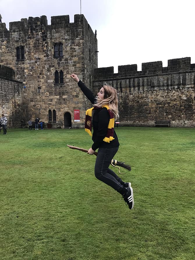 Carmen attempts to take some flying lessons using what she refers to as her Harry Potter broomstick at Alnwick Castle. The Harry Potter flying scenes were filmed here.