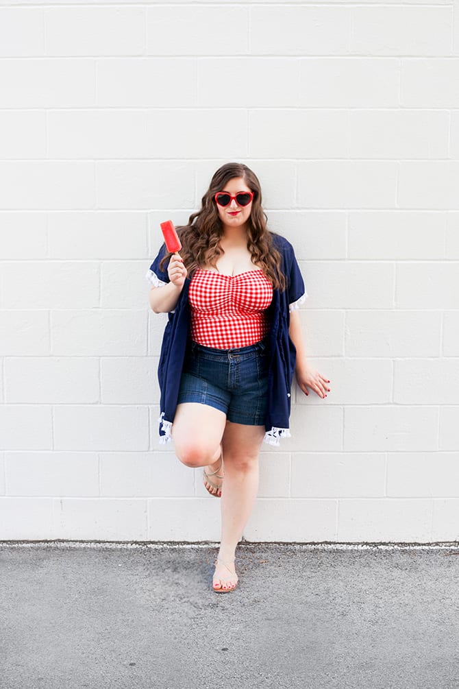 It’s hot out there! On off days it makes you practically want to live in your bathing suit, so I thought, what better way to show off my summer style than to rock my red gingham one-piece, jean shorts, and this elegant navy kimono? I’m pool ready anytime.