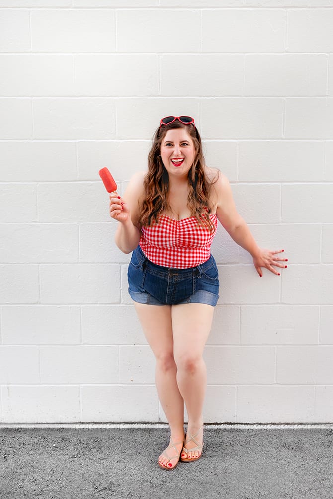I love polished, preppy looks. Some staples in my wardrobe are: Navy pieces, pops of red, polka dots, pearls, Kate Spade bags, pastel pinks, Sperrys, and stripes. I like to show off my cheery side in a bright, classy way. My bathing suit is a vintage look (pin-up girl-esque) and helps show off my curves. I’ve lost over 45 pounds since March of this year, and finding summer pieces that help show off my healthier figure is an exciting experience.