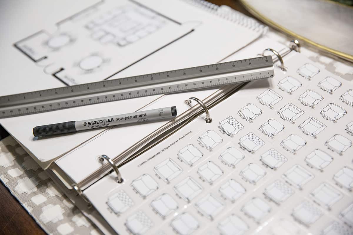 Erika’s valued tool is her furniture and room planner. In it she hand-draws the dimensions of the room with windows, doors, and fireplaces noted. “The book has the style and size of all sorts of tables, desks, sofas, beds, entertainment centers, ottomans, and even chaise longues. We take the furniture and play around with placement — which way is the sofa going to look best in this room. We put it all together and make the space plan, then offer the client two or three options, although sometimes there may be only one way that furniture can be arranged in the space. We show the selections to the clients. They may love it all but hate the lamp or a certain fabric. It may take one or two times to tweak the look.”