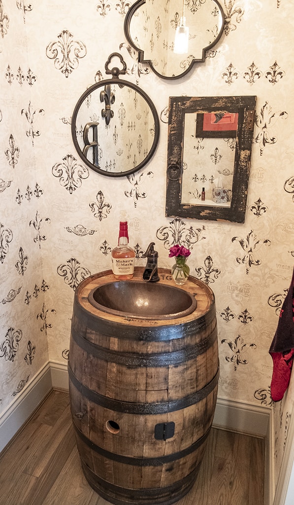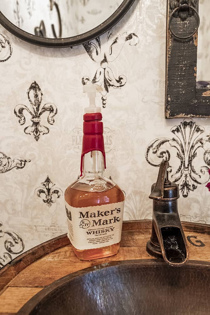 Missy’s husband, John, a firefighter, is also a gifted craftsman and has created one-of-a kind bourbon-themed furnishings such as a headboard made from the wood of bourbon barrels, known as bourbon staves. Missy also re-purposed or refinished 27 pieces of furniture that were in her family, such as a dining room buffet in the living room that they distressed and reinvented as the tasting bar adorned with bottles of bourbon.