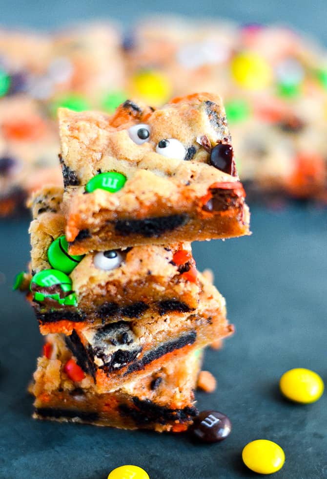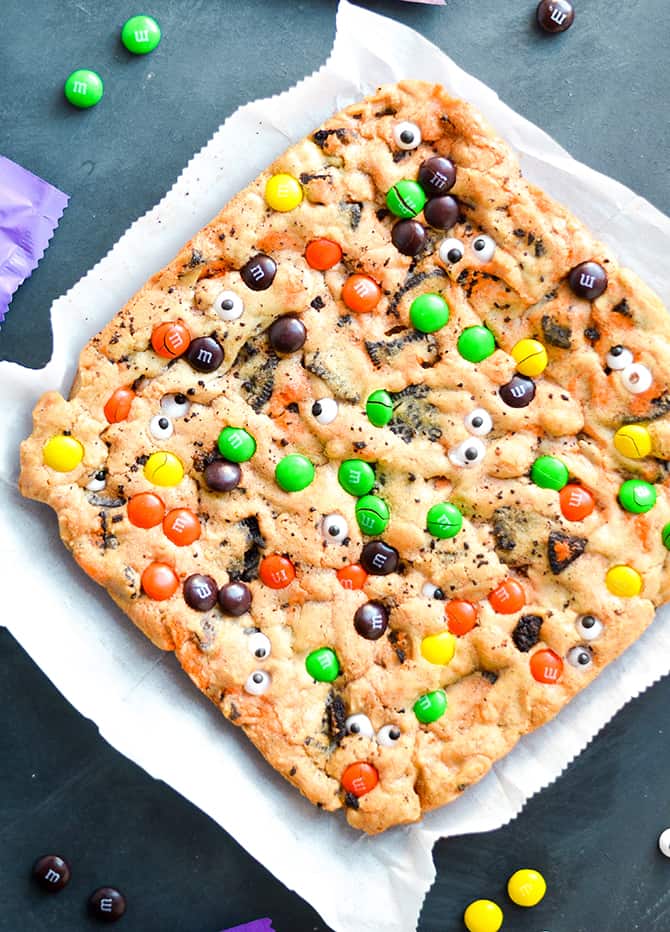 This recipe is the perfect way to get rid of the leftover chocolate that may have gotten picked over by the persnickety ghosts and goblins of Halloween night. Of course, you can make these any time of the year, but if you do decide to make them this season, they’re made particularly ghoulish with the addition of candy eyes. Now, open up those fun-size M&M’s and get to baking!