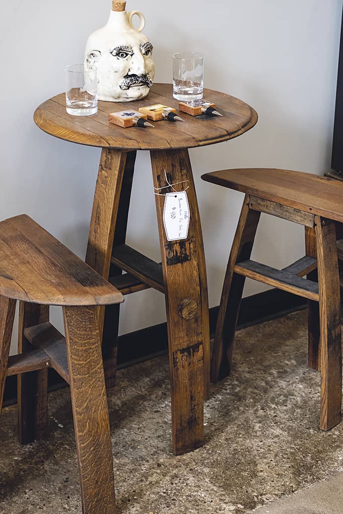 Bourbon barrel table and stools: by Taste of Bourbon Mastery