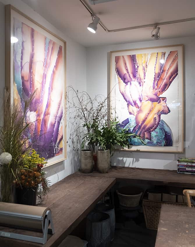 “These paintings say everything about us: the use of vibrant tones, the bloom of watercolor, and the fact that they are cactus. They are part of who we are,” Bridget says.