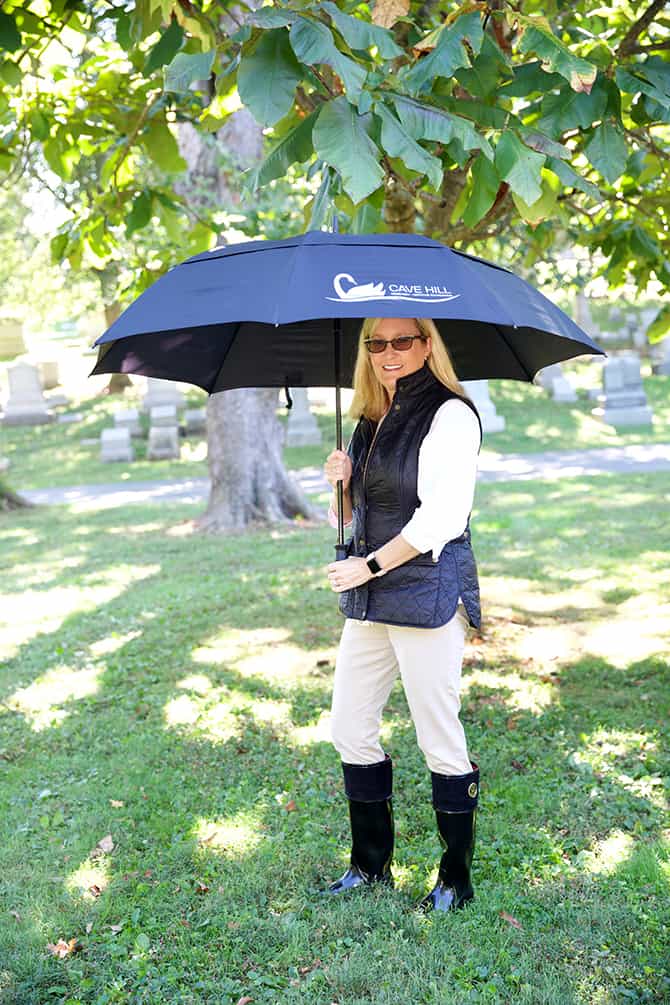 I have two pairs of wellies. The more casual pair are green Hunters and are for tromping over muddy ground. The other pair are Tommy Hilfiger black patent leather rubber boots for a little more formal look. I also carry with me a big black umbrella with the Cave Hill swan logo. All my shoes have a wedge heel. I couldn’t wear high heels because I would just be sinking down into the ground.