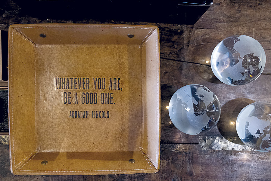LEATHER TRAY $36, GLOBE PAPERWEIGHT $17; Secret Garden