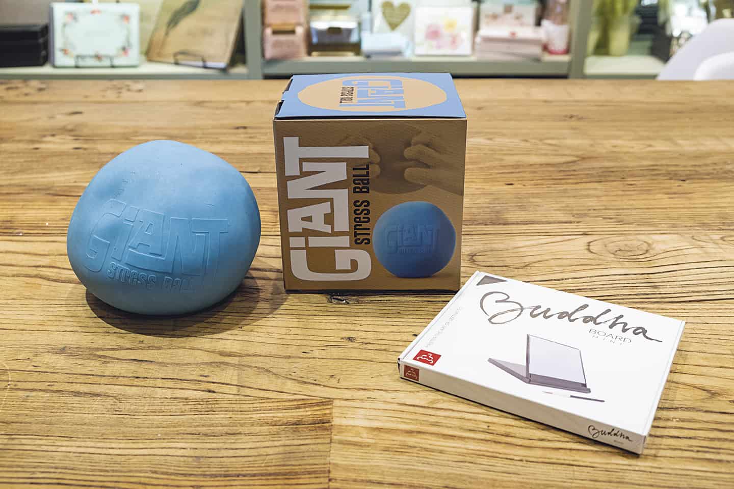 STRESS RELIEVERS, GIANT STRESS BALL $15.95, BUDDHA BOARD MINI $14.95; Paper Source