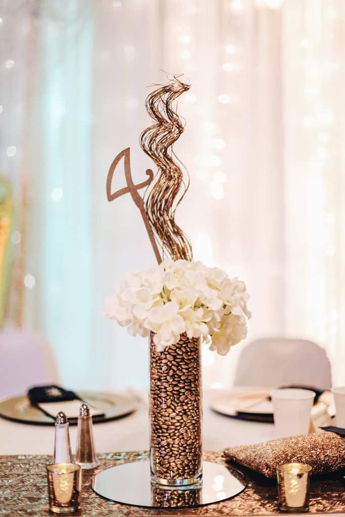Hobby Lobby and Amazon are life savers. Also, gold spray paint is the real MVP. I used dried pinto beans for my vase filler and spray painted them gold. So cheap, but looked amazing. I also purchased a few items from wedding sales on Facebook. I bought table runners from linentablecloth.com that were nice looking and budget friendly.