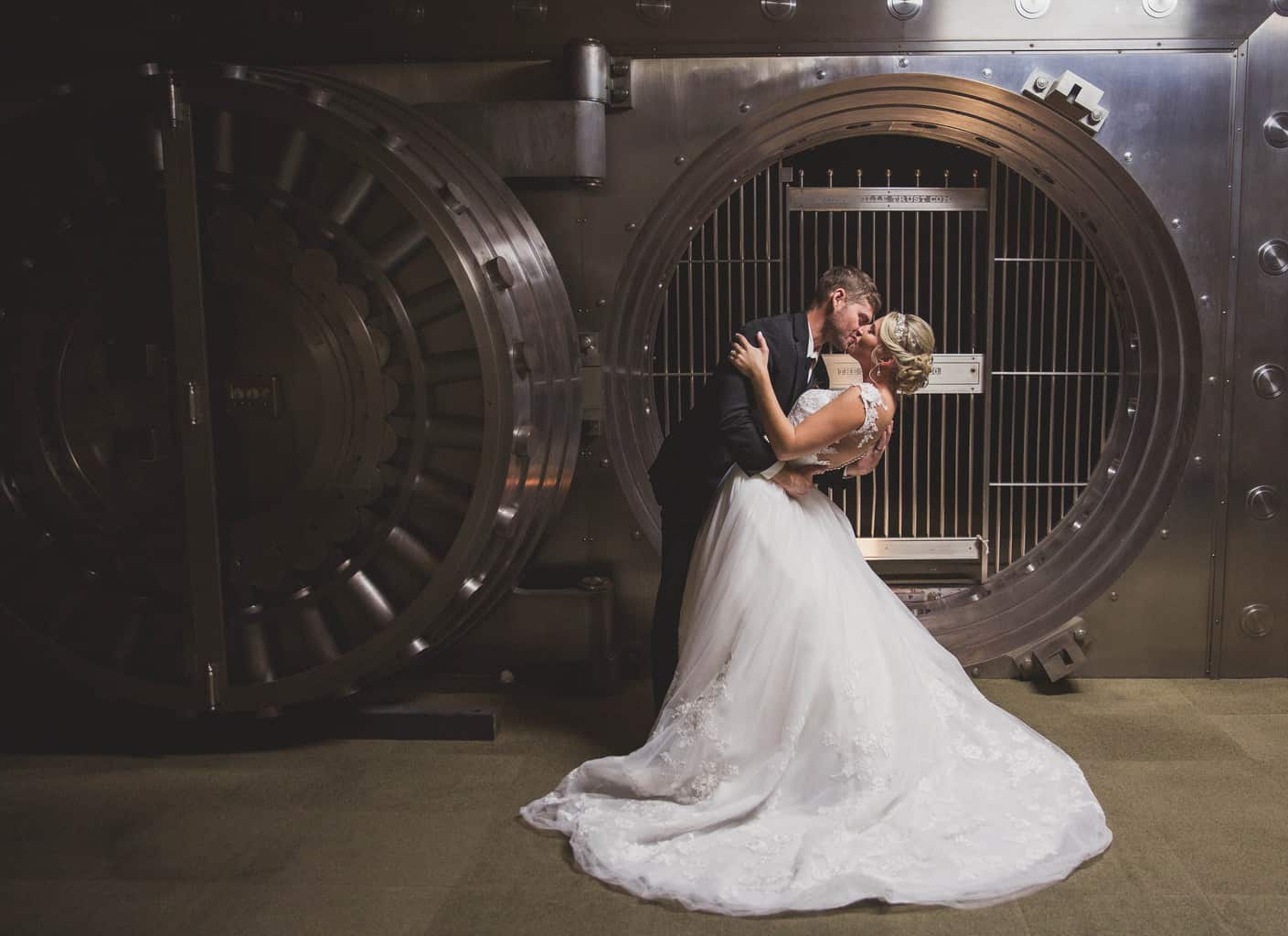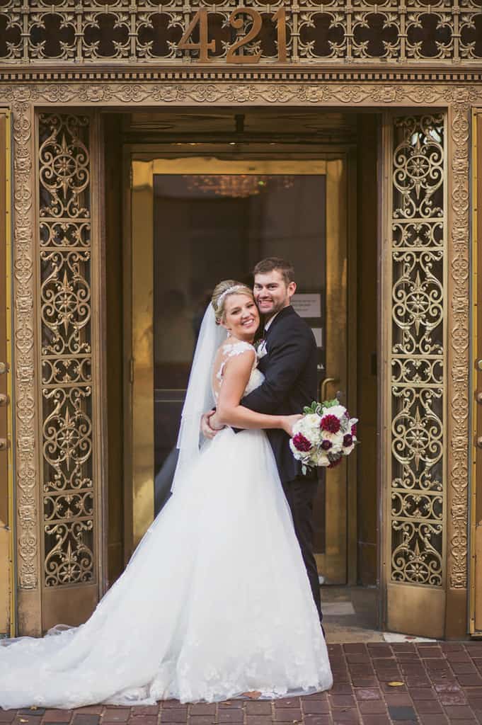 The couple had both the ceremony and the reception in the Grand Ballroom of the Gillespie, a former bank (see the photo with the original vault), with the guests moving to a balcony while the space was switched from ceremony to reception.