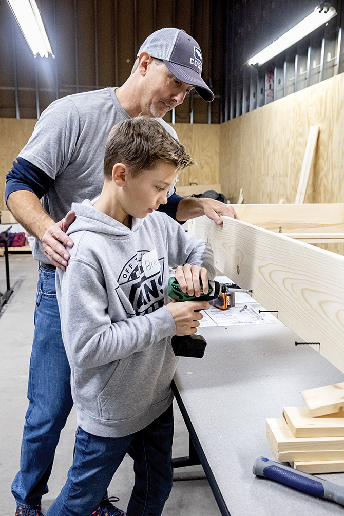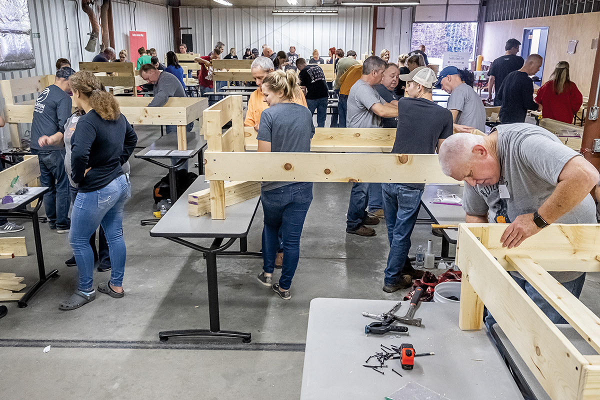 At a recent Southern Indiana event for Clark and Floyd counties, the ‘build room’ at the Ivy Tech Training Facility in Jeffersonville, Indiana, was buzzing with excitement and the smell of lumber filled the air. Teams of volunteers filled the space with tools in hand, ready to assemble the bed kits in front of them. No special skills are required to build the beds: students from Prosser Career Education Center in New Albany, Indiana, had already prepped the lumber for all 150 beds by sanding, rounding edges, and pre-drilling holes. In all, more than 180 volunteers assisted in a single day to assemble beds and bedding packages. Each time a team finished a bed, they rang a bell, and the sound of those bells ringing throughout the busy room brought a rousing cheer each time.
