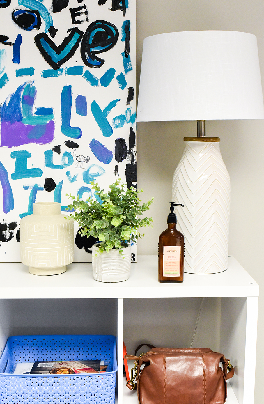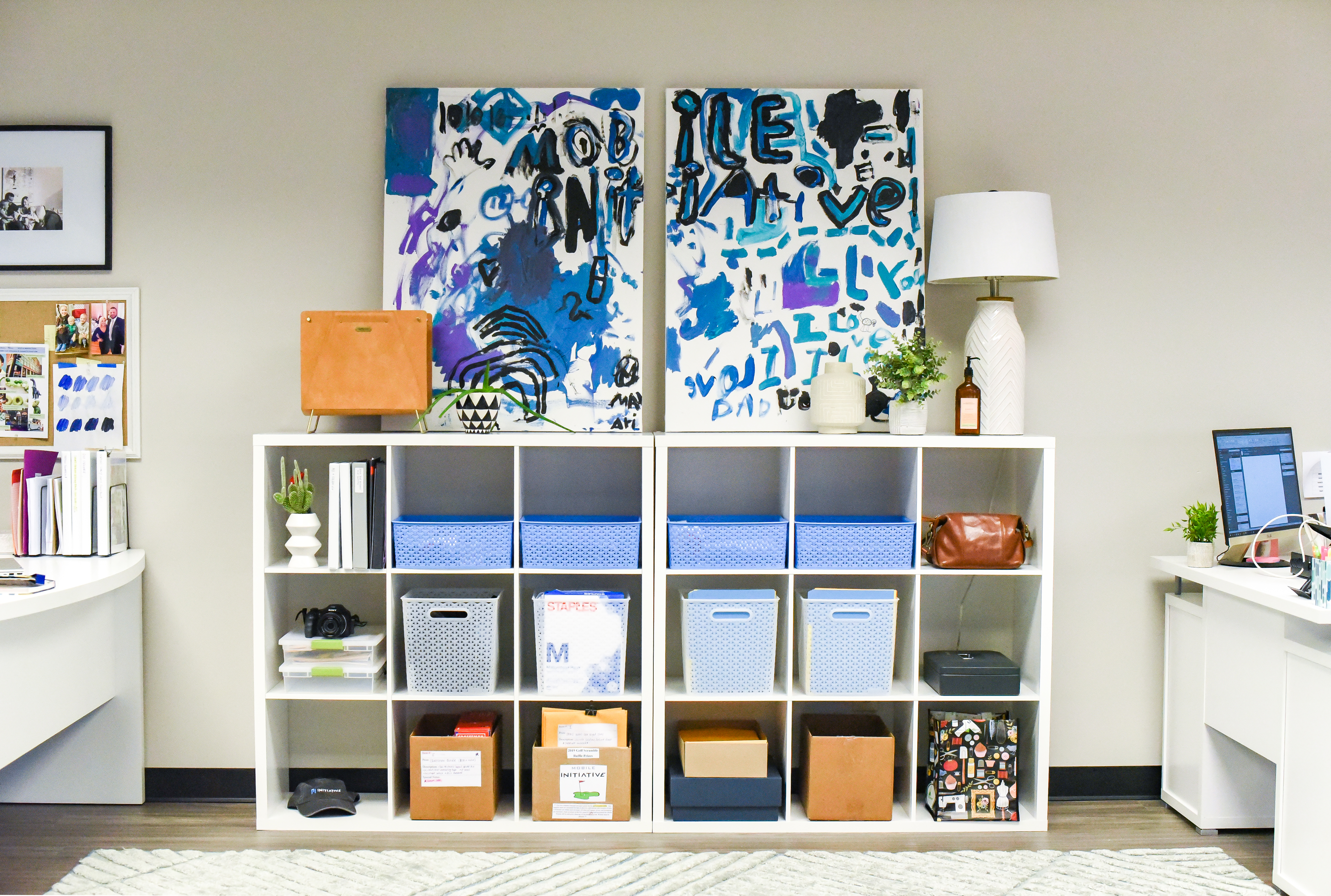 Lauren’s two boys created this “abstract” Mobile Initiative painting, she gave them limited colors to reflect company branding. The result is dramatic, custom, and fun. (Budget friendly, too!)