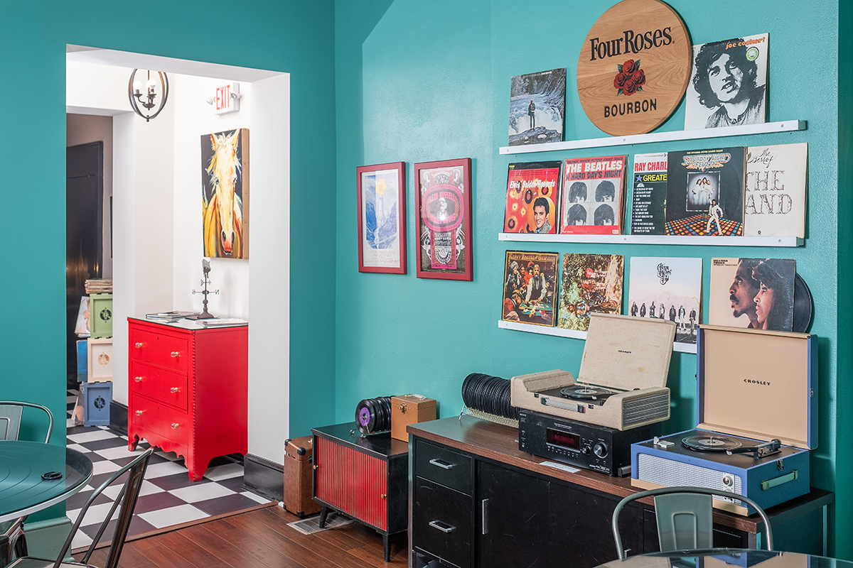 As you enter the completely renovated 5,000 square-foot space, you are reminded why Forbes deemed Louisville one of America’s coolest cities. Throughout the vibrant, festive space, bins of records wait to be spun on the 12 colorful Crosley record players that adorn each room. Three giant record-shaped tables line the dining room, and pictures of Louisville neighborhoods, famous Louisville natives, and loads of album covers line the walls. This is a place to have an unforgettable party–and your hosts Kim and Kate Lesak (sisters and business partners) have painstakingly cultivated an environment of fun.