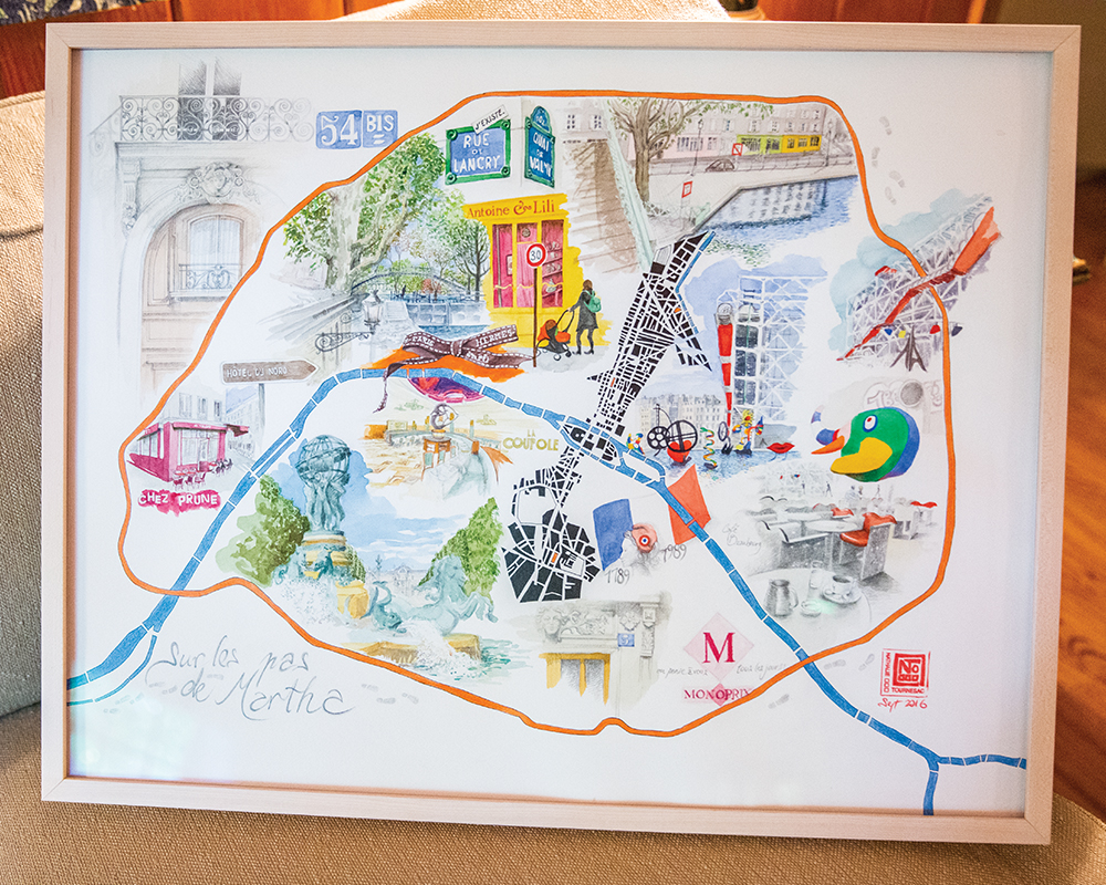 A depiction of Martha’s love of France, painted for her by a French painter. The map shows her path through France.