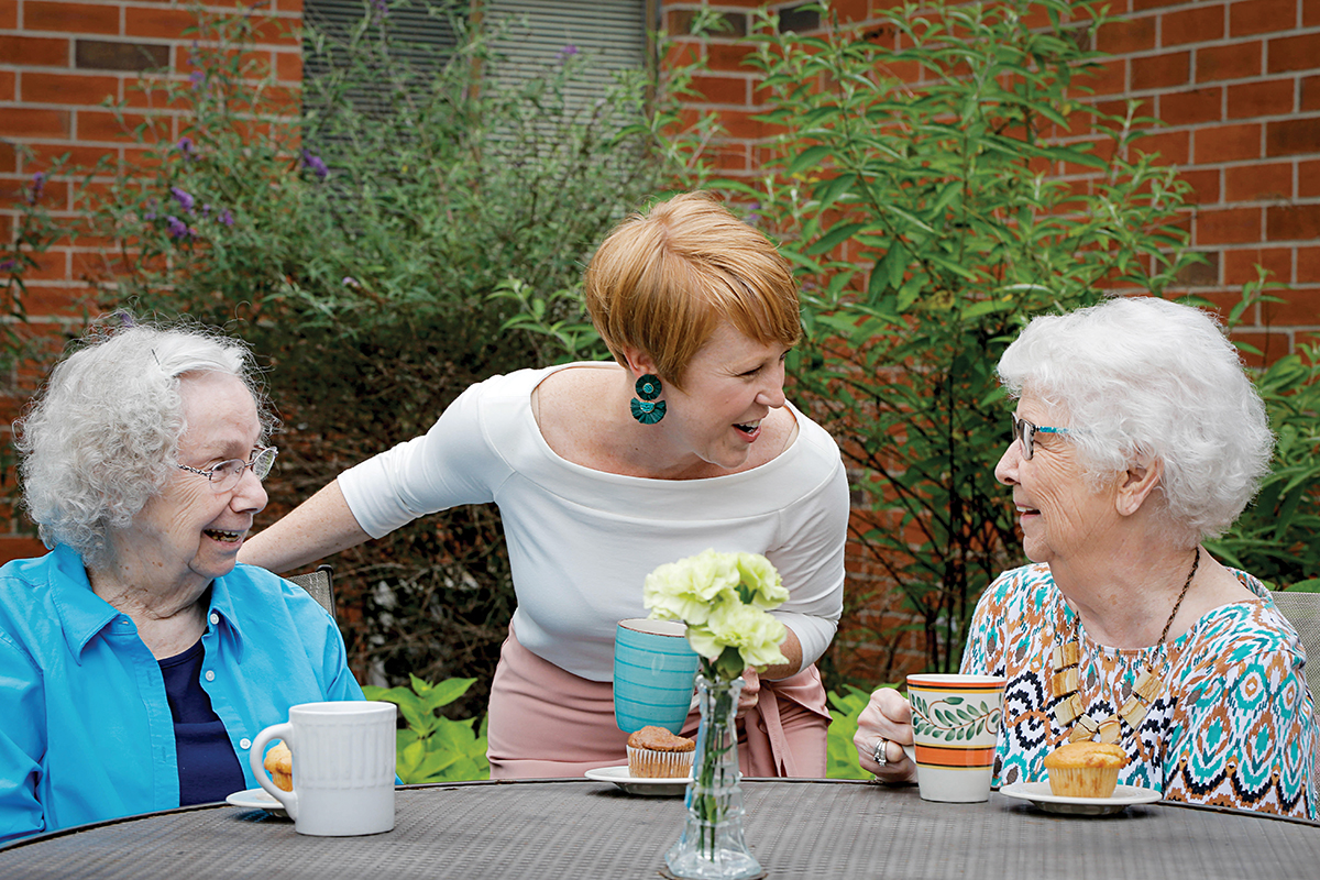 Brownsboro Park Executive Director Kelli Tyler (center) enjoys some social time with residents Jessie Romine (left) and Nancy Quinley.