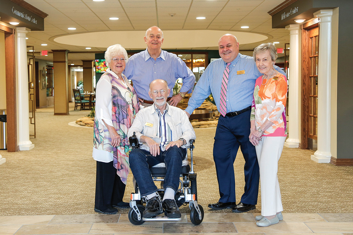 From L to R: Lake Forest Village residents Jan, Damian (in wheelchair), Ron, Lake Forest Village Live-In Manager Dale Mowery, and resident Connie.