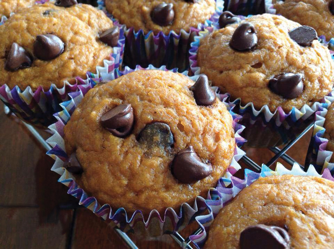 3. Gently fold in the chocolate chips, then layer paper cups into a muffin tin, scoop the batter into each cup, top with a few chocolate chips, and bake at 350 for about 20 minutes, or until a toothpick inserted into the center of a muffin comes out clean of batter (it will be chocolatey).