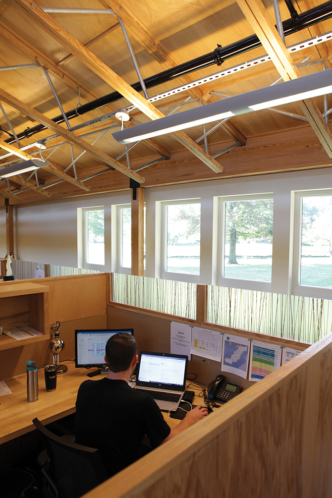 Bright open area with natural light offers a good space to work, as well as a lake with benches outside of the office to take away stress.