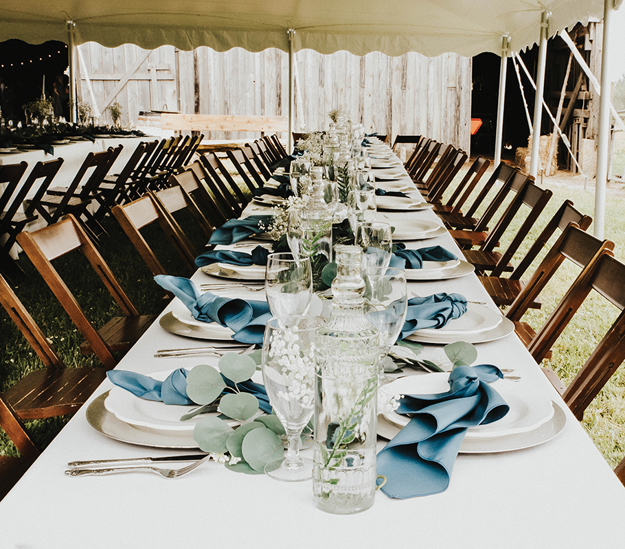 Special Choices: banquet tables, farm table, dark walnut folding chairs, china plates, silverware, linen napkins, water goblets