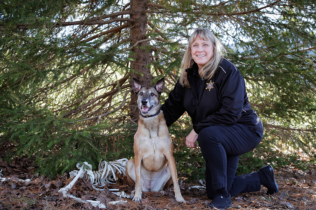 When Bella, her Belgian Malinois, was only 10-12 weeks old, Jefferson County Coroner Barbara Weakley-Jones began training her in the art of human remains detection. Barbara, who trained six previous cadaver dogs, began by placing blood or decomposed tissue in one of three concrete blocks. When Bella, now 9, would show interest in the scent, she would receive a reward — the bounce of a tennis ball, her favorite toy. Soon, Bella learned to detect the scent with the command “Find it” and signal her detection with a bark.